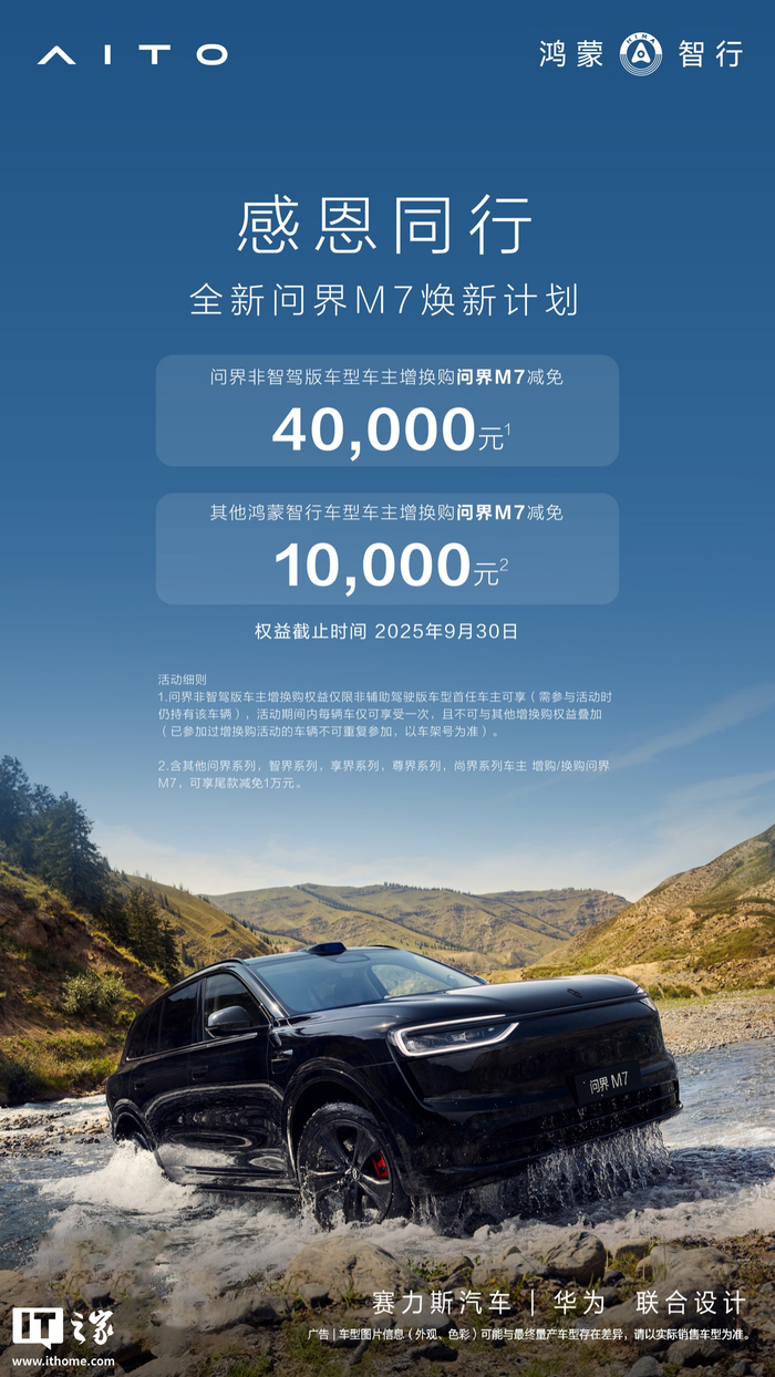 IT之家注意到,问界汽车官方还推出了全新问界 M7 焕新计划,其中:问界非辅助驾驶版车主增换购享 40000 元减免、鸿蒙智行其他车型车主增换购享 10000 元减免。该权益截止时间为 2025 年 9 月 30 日。活动细则如下:
