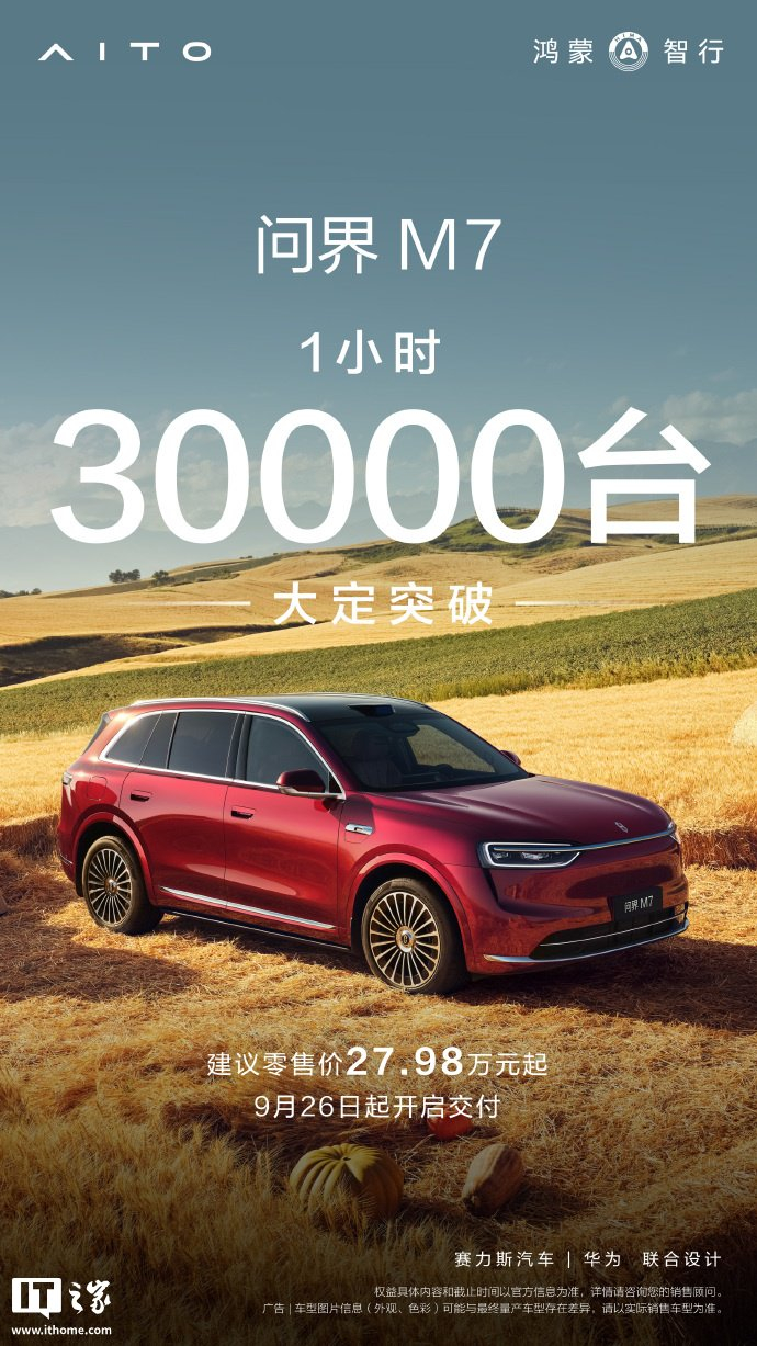 根据官方最新销售数据,全新问界 M7 新车 1 小时大定破 3 万台、5 分钟大定破 1 万台。